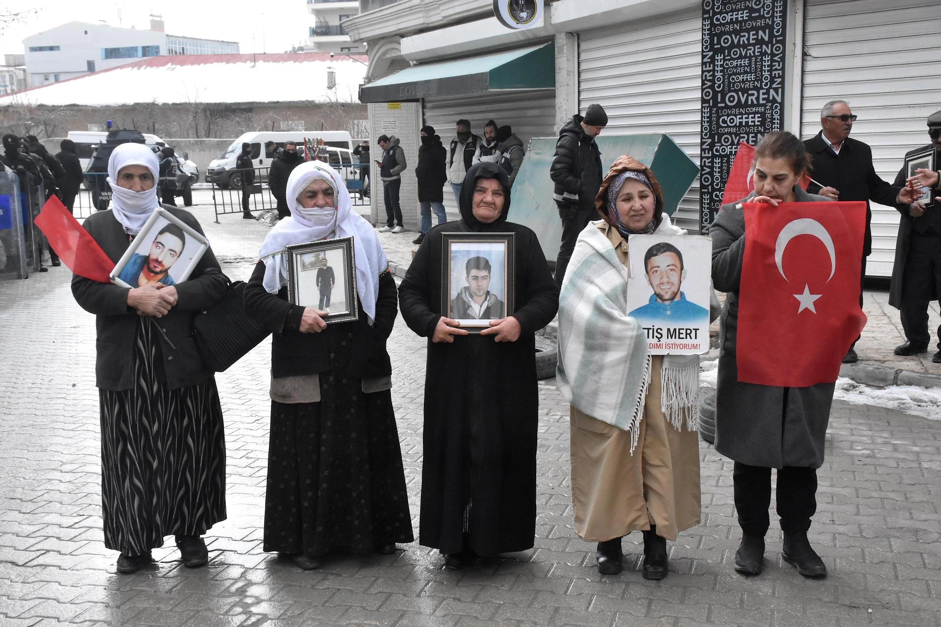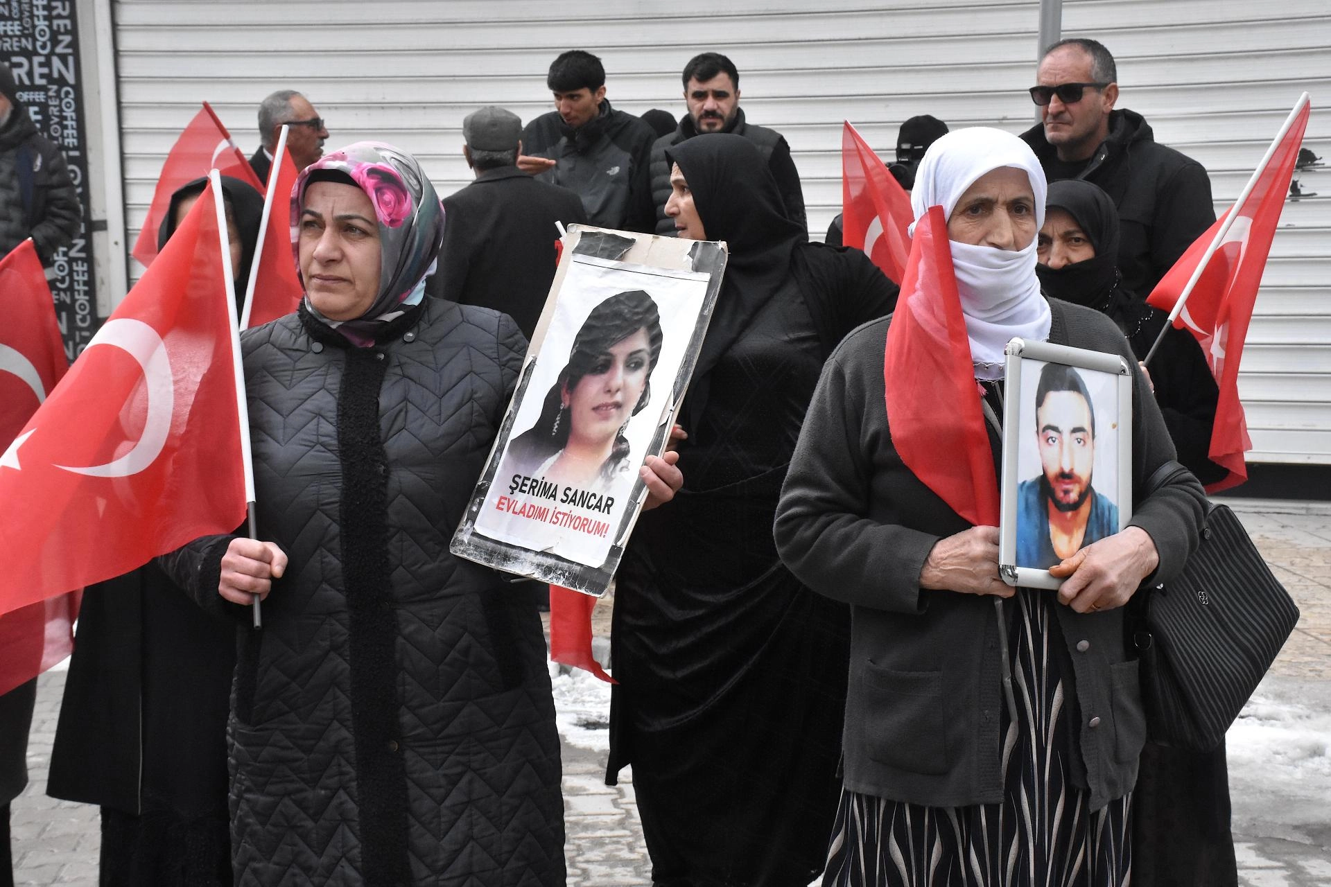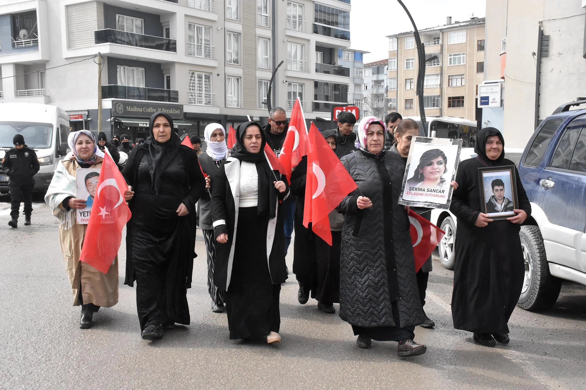Menekşe Sokak'ta bir araya gelen aileler, Türk bayrakları ve evlatlarının fotoğraflarını taşıyarak DEM Parti İl Başkanlığı binası önüne kadar yürüdü.