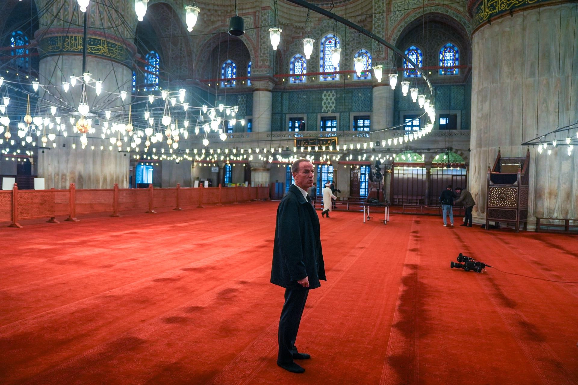 Sultanahmet Camisi müezzini Aşgın Musa Tunca, Papa 14. Leo'ya cami hakkında bilgi verdi.