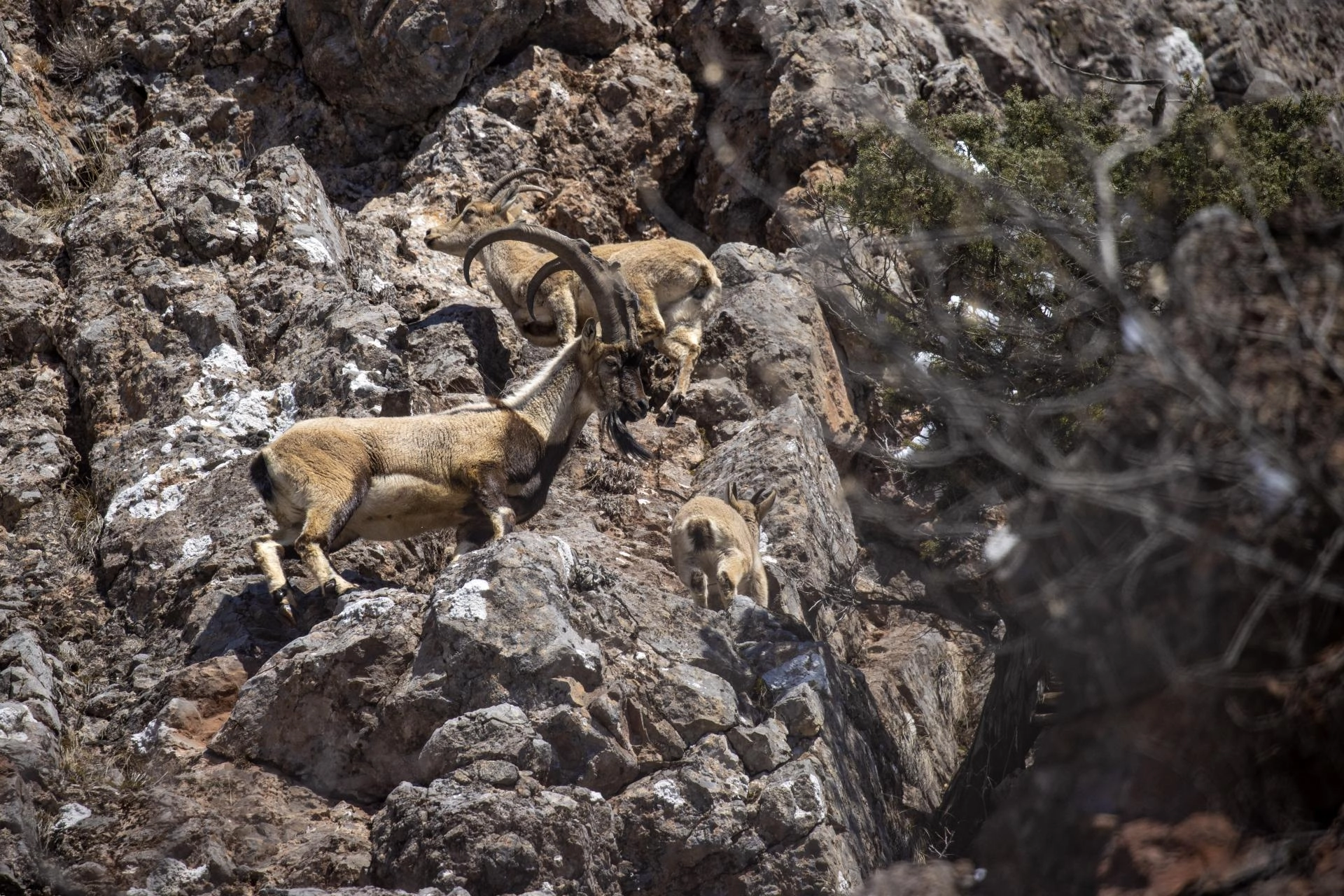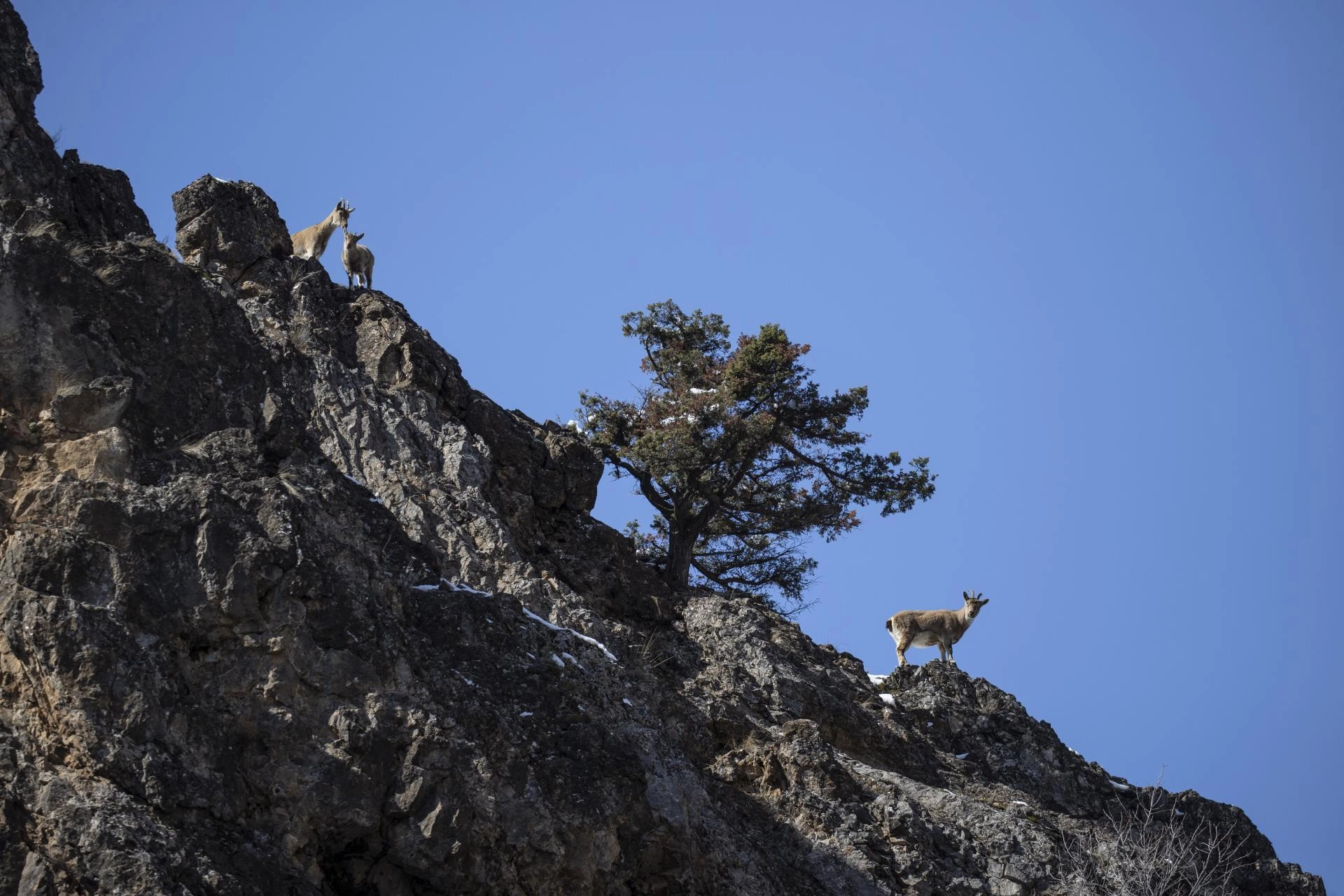 Sürü halinde hareket eden yaban keçileri, tırmandıkları kayalıklarda meşe dalları ve kuru otlarla beslenirken kayıt altına alındı.