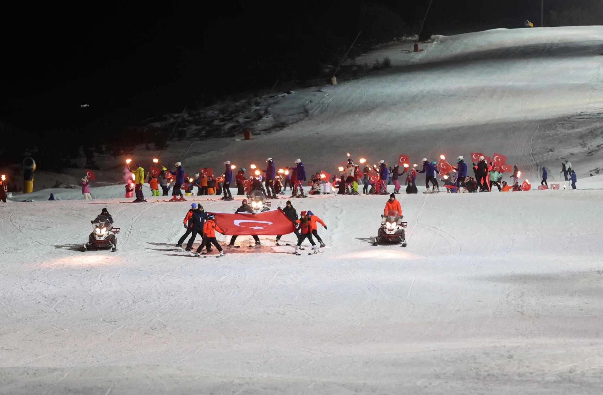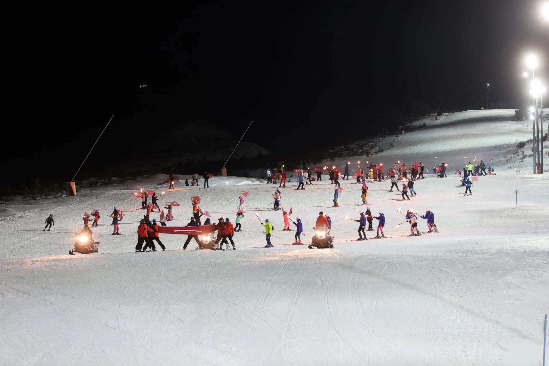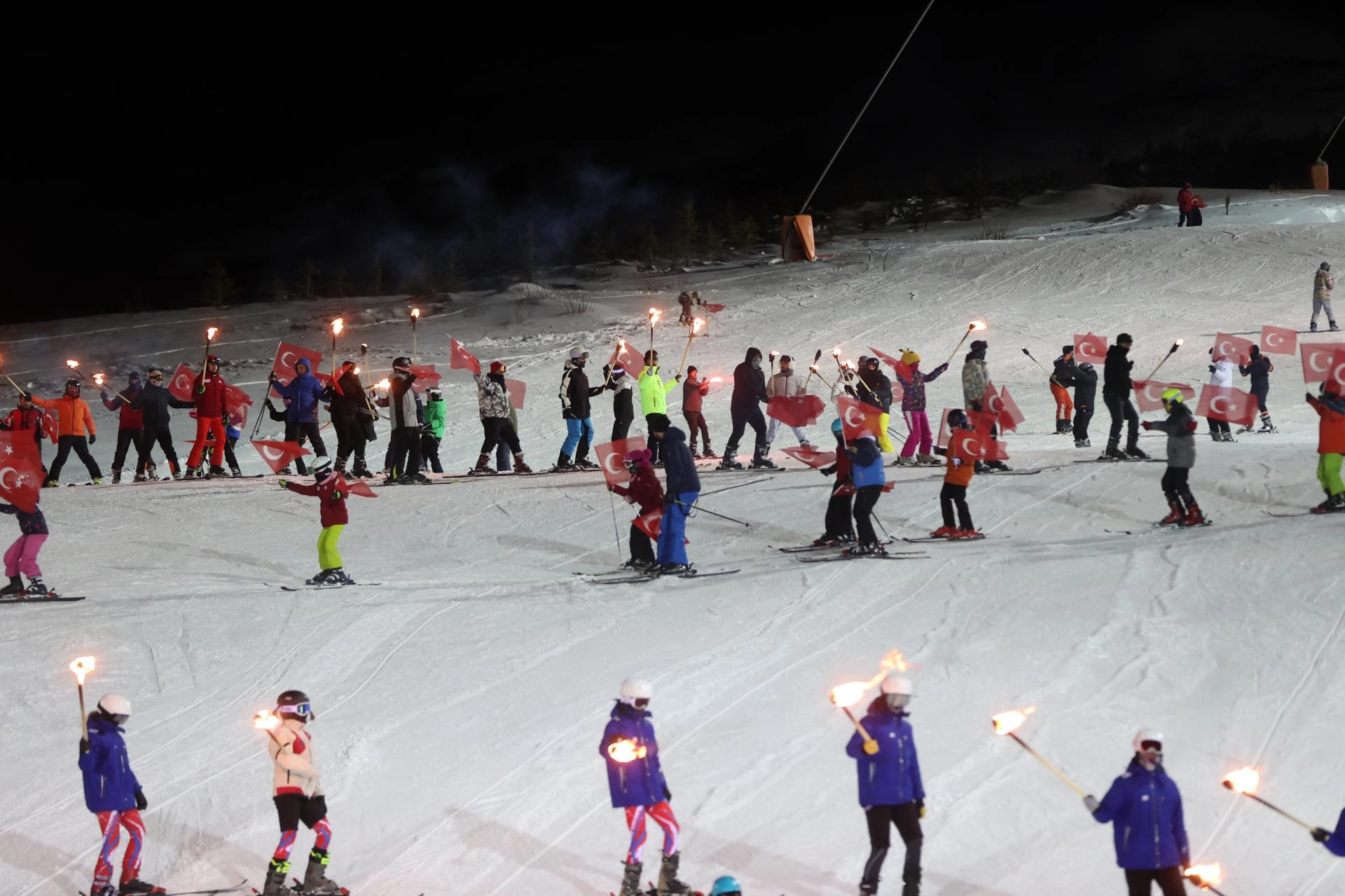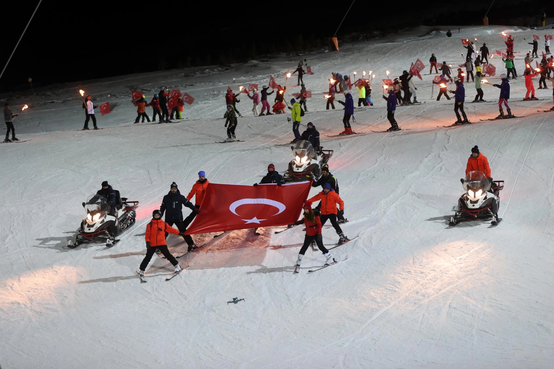 Vatandaşların halaylar çekerek eğlendiği merkezde, kayakçılar ellerinde meşaleler ve Türk bayraklarıyla sezon açılışını gerçekleştirdi.