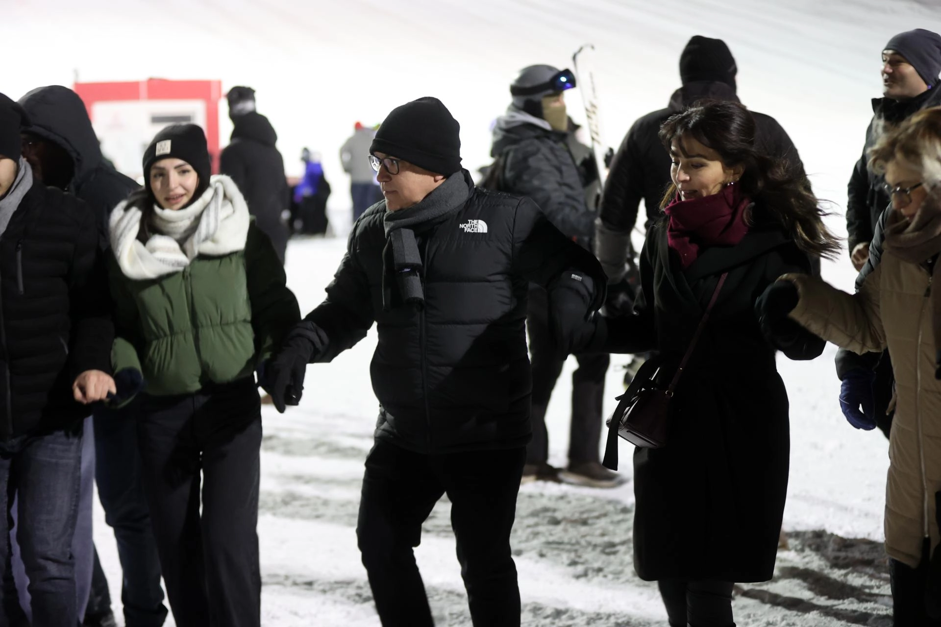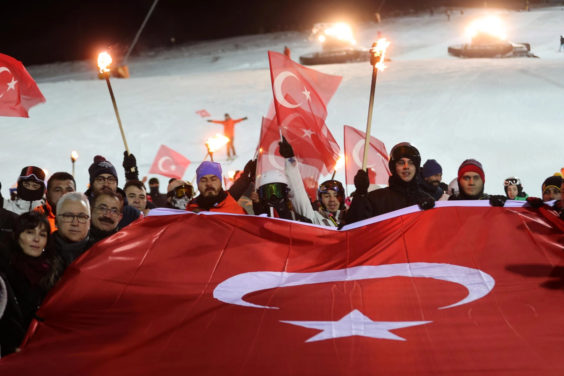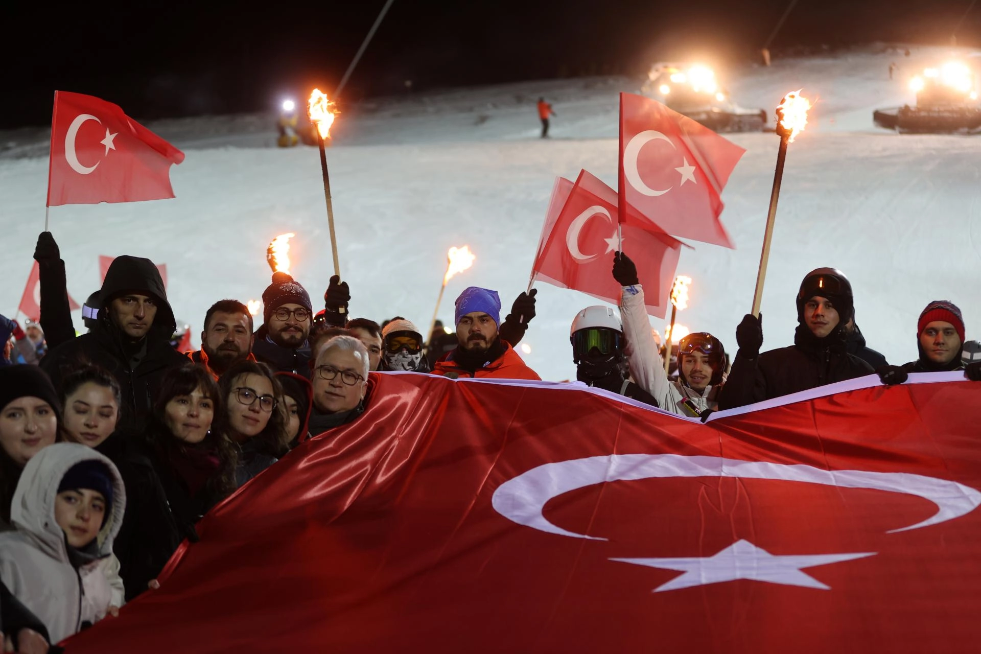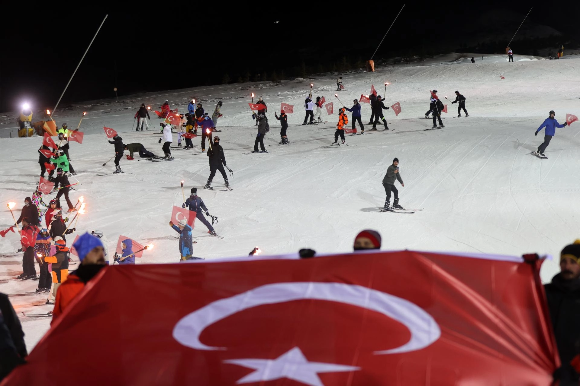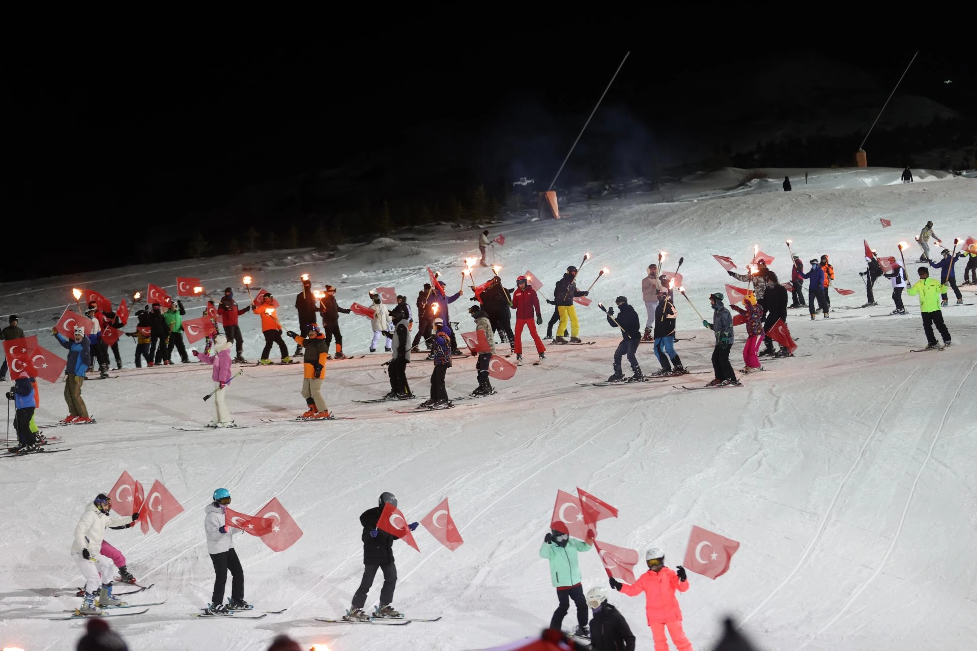 Vatandaşların halaylar çekerek eğlendiği merkezde, kayakçılar ellerinde meşaleler ve Türk bayraklarıyla sezon açılışını gerçekleştirdi.