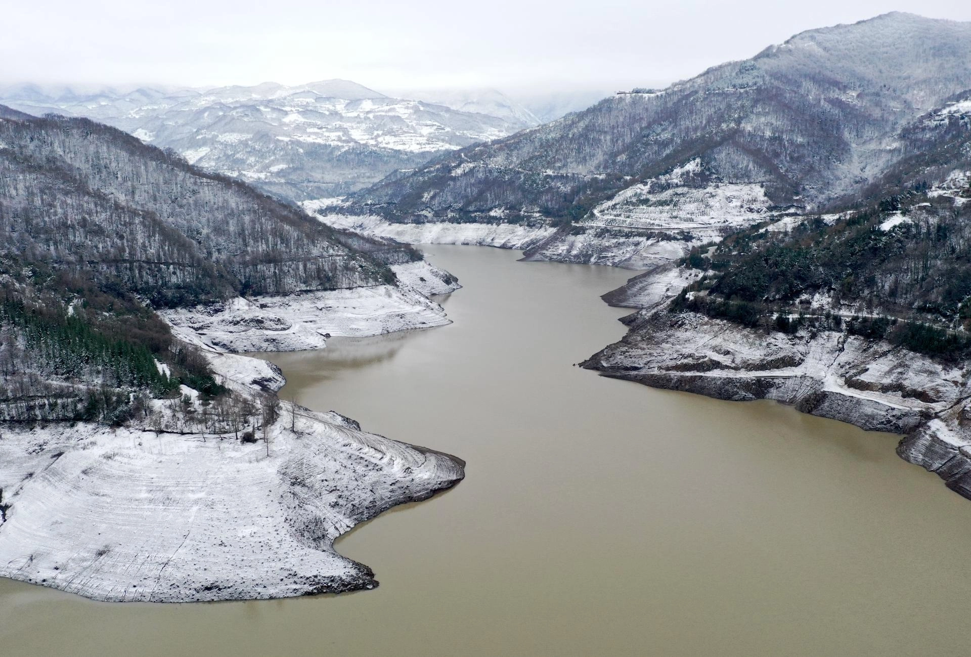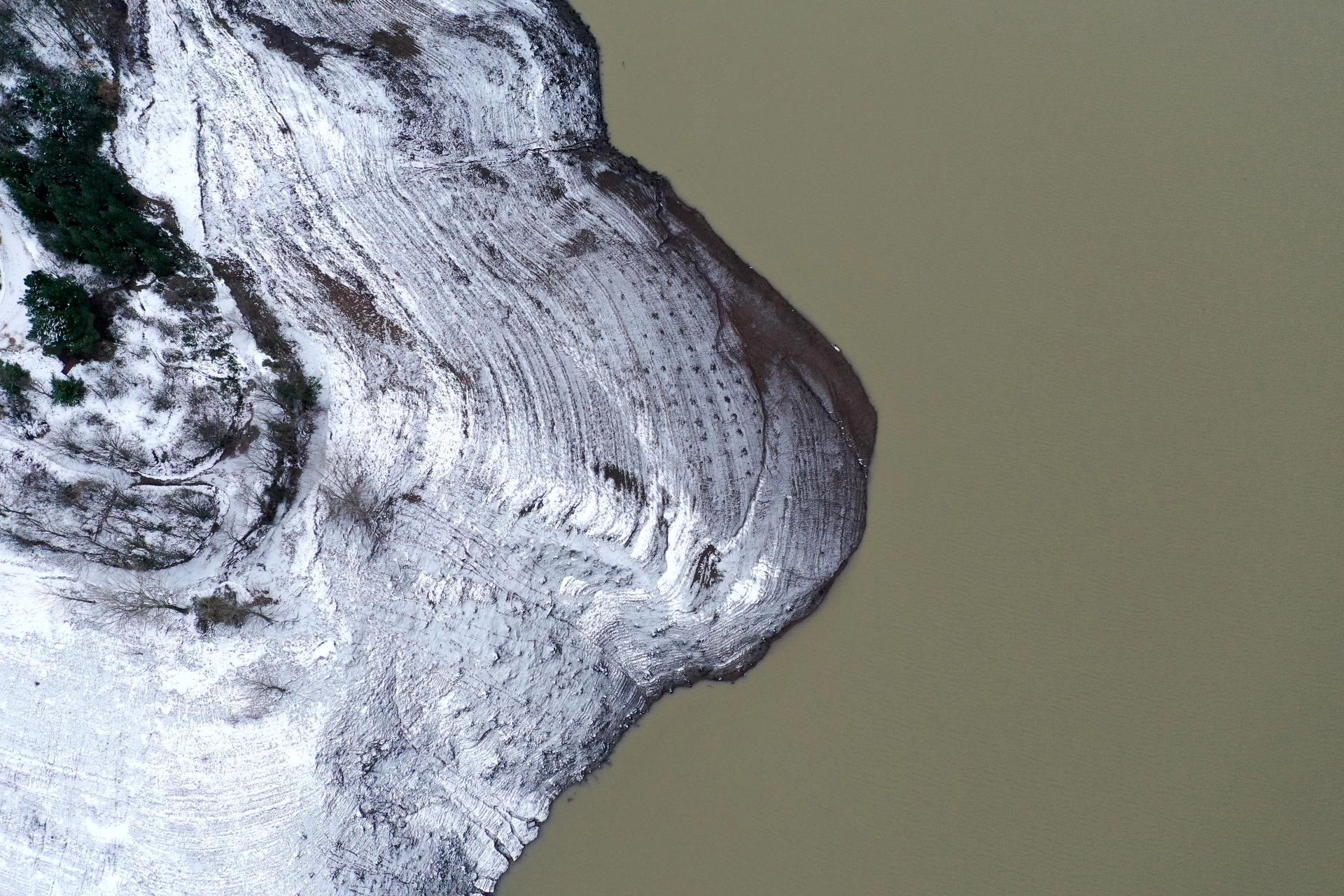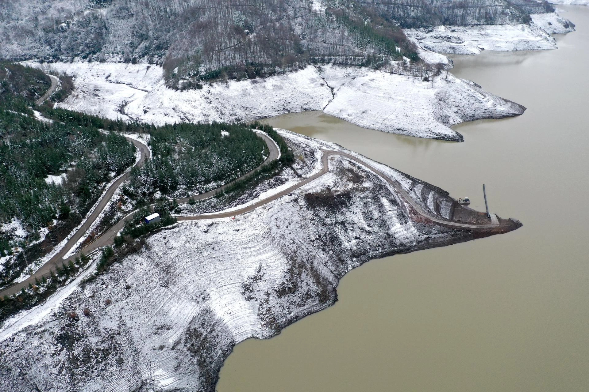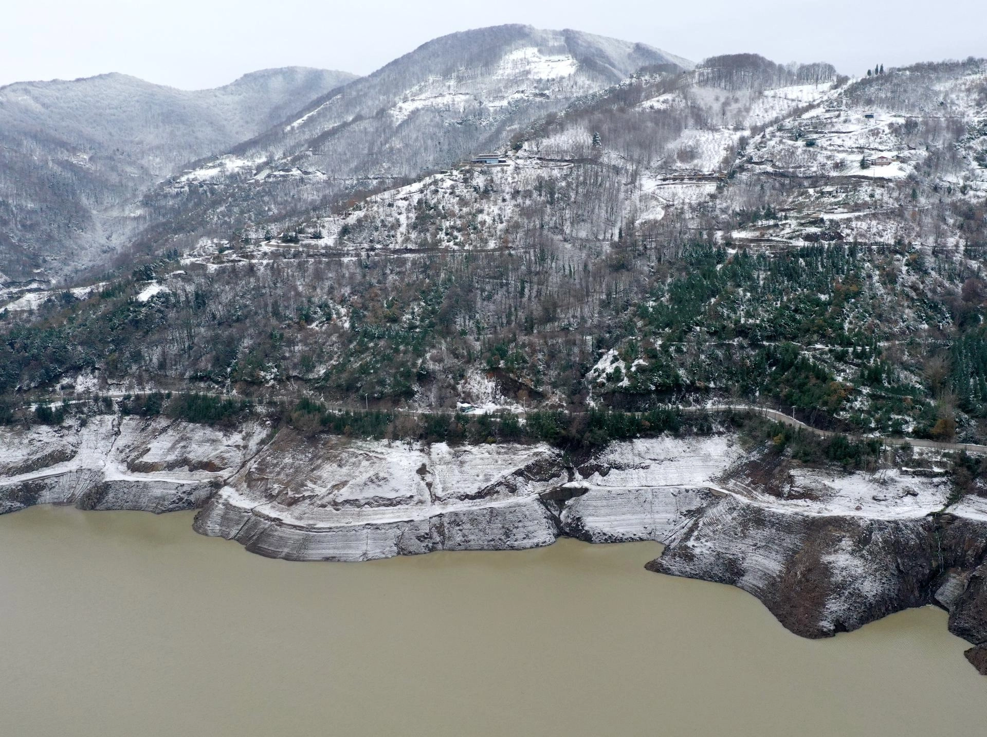 Baraj çevresinde beyaz örtüyle kaplanan ağaçların oluşturduğu manzara havadan görüntülendi.