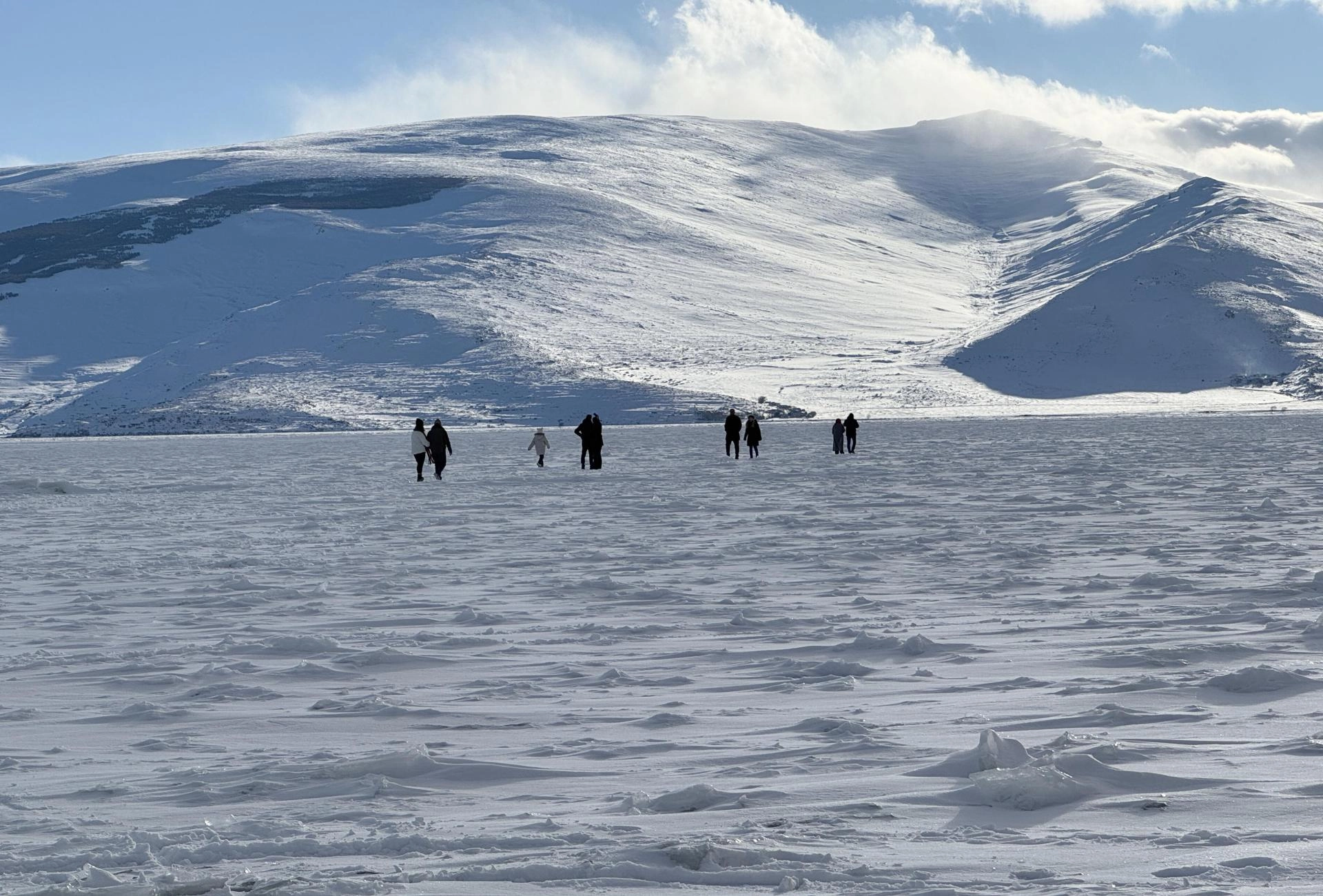 Buz üzerinde gezinti yapan turistler, gölün manzarasını görüntülemeye çalışıyor.