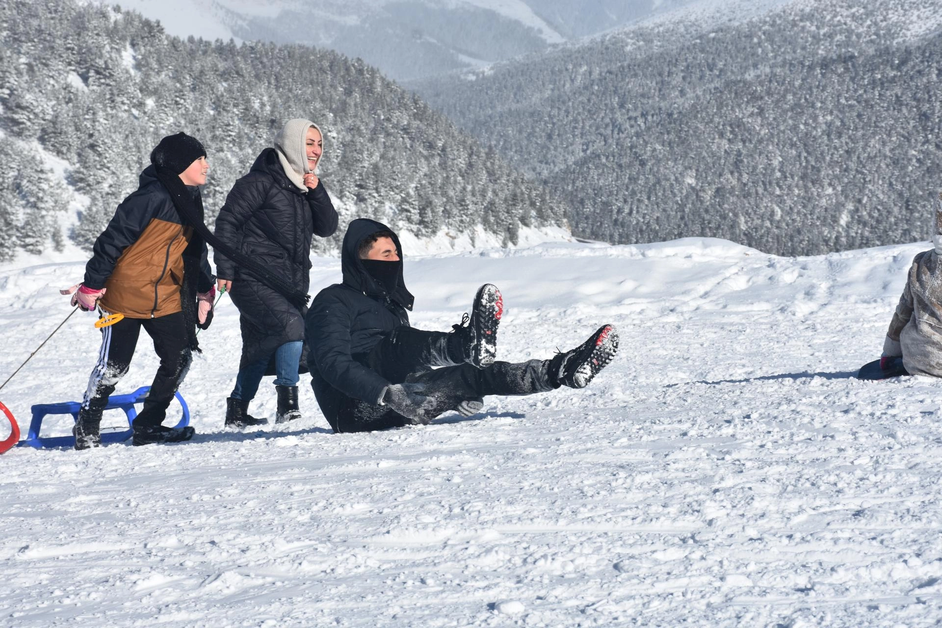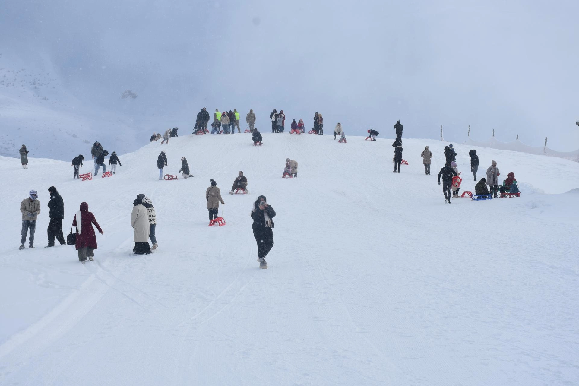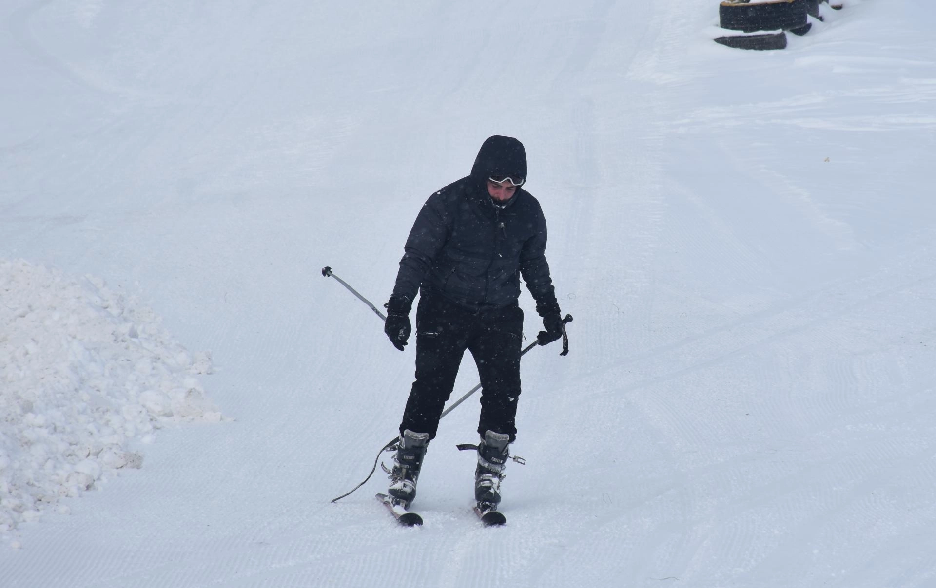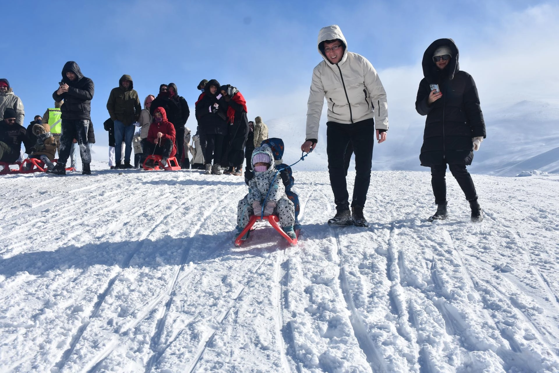 Kayak merkezindeki 800 ve 600 metre uzunluğundaki iki pistte kayak yapan ziyaretçiler, aynı zamanda kızak sürerek karın tadını çıkarıyor.
