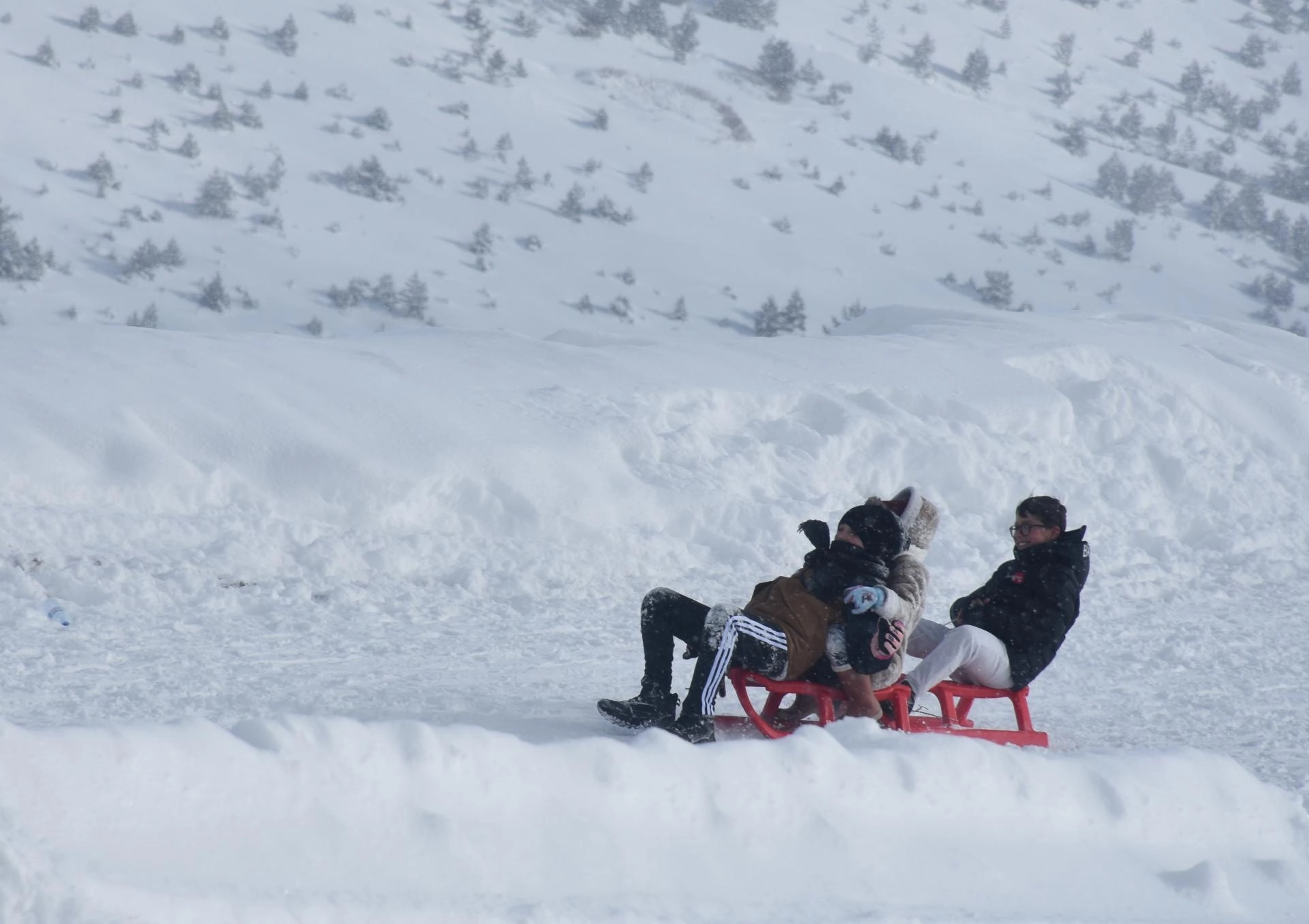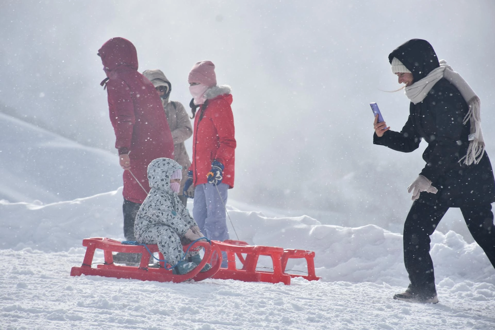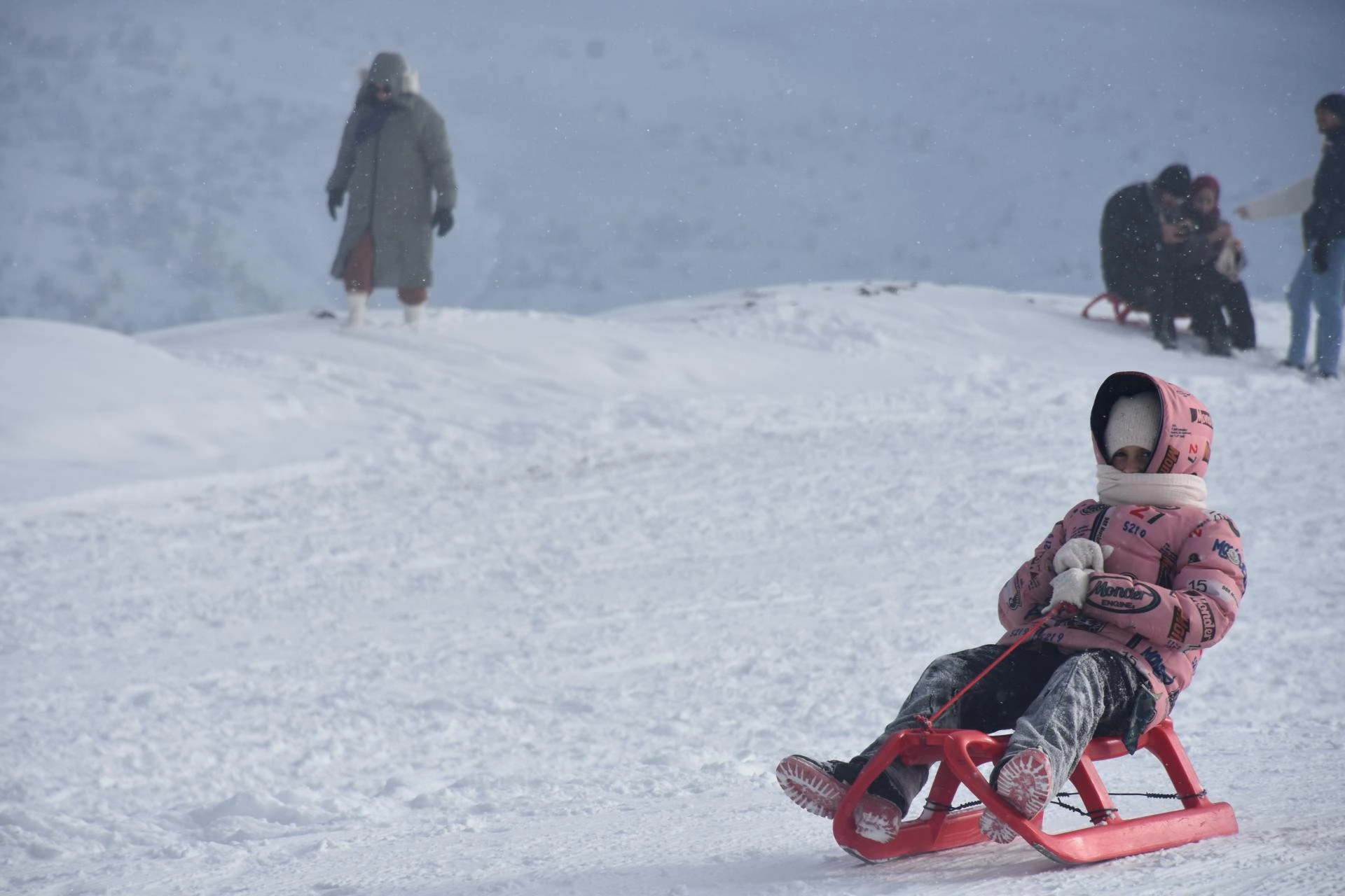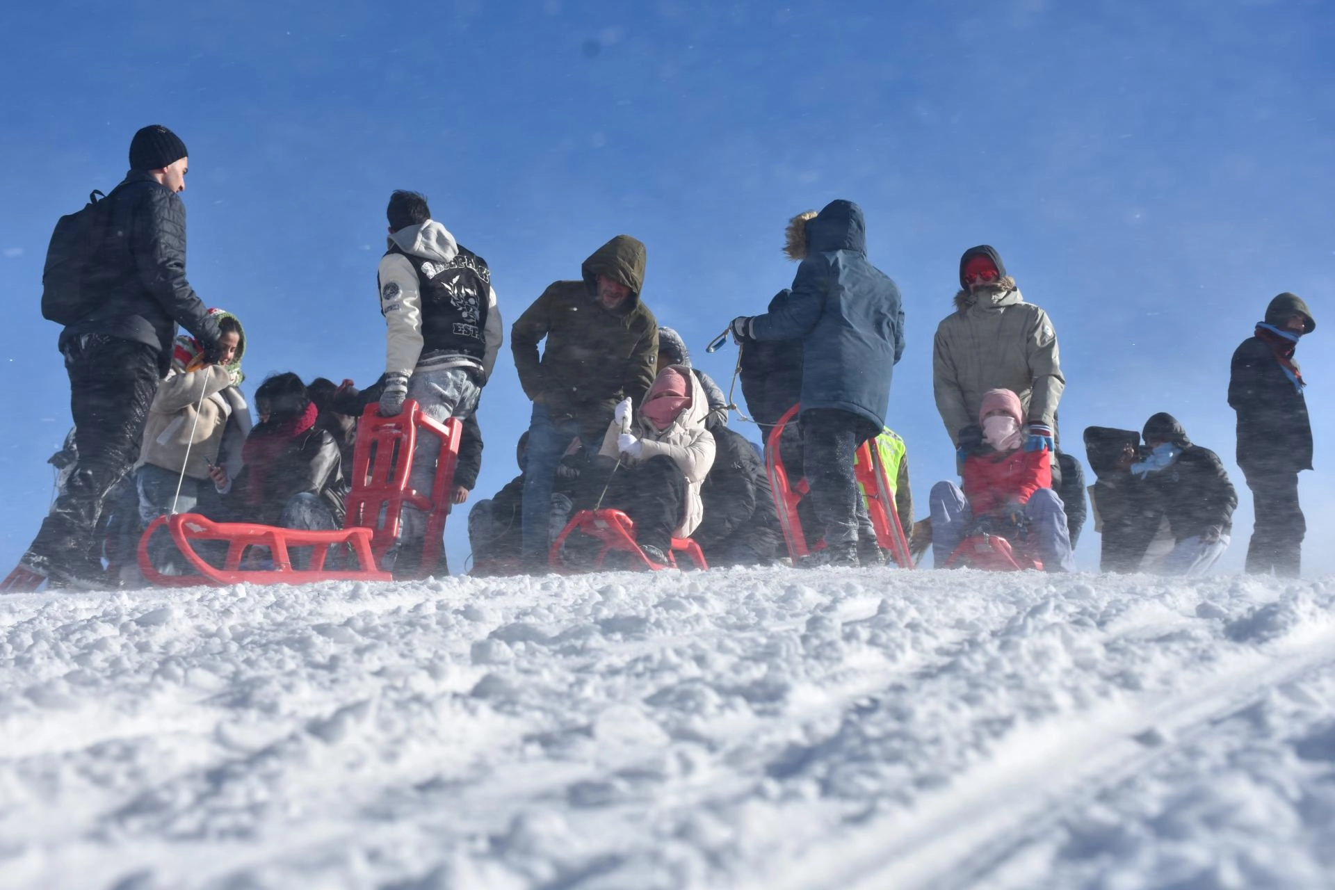 Kayak merkezindeki 800 ve 600 metre uzunluğundaki iki pistte kayak yapan ziyaretçiler, aynı zamanda kızak sürerek karın tadını çıkarıyor.